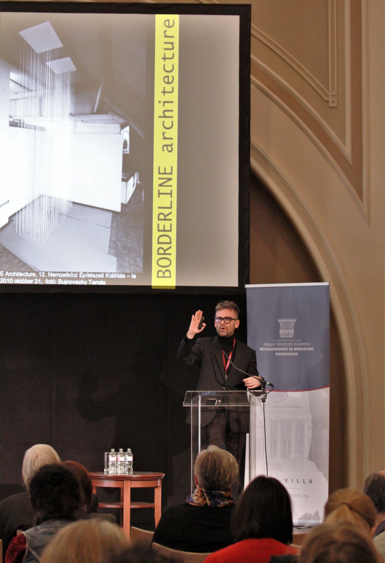Wesselényi-Garay Andor építész, a Magyar Művészeti Akadémia Művészetelméleti és Módszertani Kutatóintézetének tudományos főmunkatársa előadásában az építészet közegét, az építészeti kiállítást és a borderline építészetet helyezte középpontba. Kiemelte, hogy amennyiben az építészetet a tudás egy speciális formájának tekintjük és engedjük kilépni abból a monomedialitásból, amelyben ennek a tudásnak az egyetlen és kizárólagos hordozója a ház, akkor a közegek és a közvetítők egymásba fonódó, egymást alakzatilag is erősítő rendszerére bukkanunk: ez a mező értelmezi és konstituálja, magyarázza és termeli az építészetet. Az előadás példákat sorakoztatott fel arra a problémára való reagálásként, hogy a múzeumba helyezett építészet szükségképp veszti el auráját, és ez egyben el is bizonytalanítja a művészeteken belül elfoglalt pozícióját.