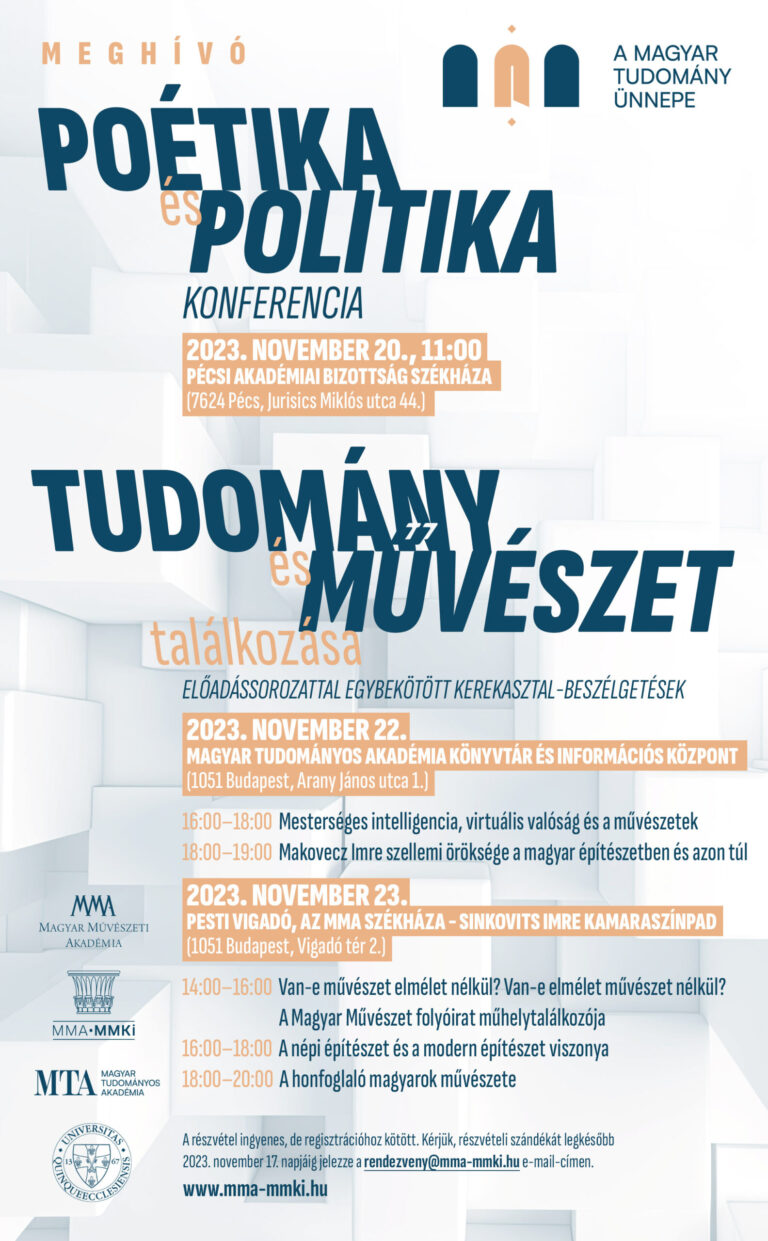 A MAGYAR TUDOMÁNY ÜNNEPE eseménysorozathoz kapcsolódóan az MMA MMKI két nagy programot is megvalósít társszervezésben. 2023. november 20-án a Pécsi Akadémiai Bizottság székháza ad otthont a Poétika és politika című zártkörű konferenciának, illetve 2023. november 22-én és 23-án Budapesten kerül sor a Tudomány és művészet találkozása című programsorozatra, amelynek keretében a kutatóintézet előadássorozatokkal egybekötött kerekasztal-beszélgetésekre invitálja a közönséget.
