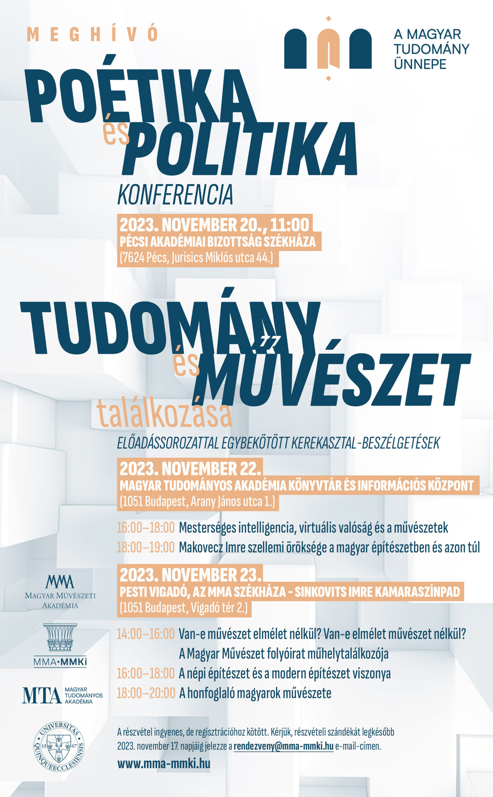 A Poétika és politika című konferencia zártkörű, a Tudomány és művészet találkozása programsorozat előadásokkal egybekötött kerekasztal-beszélgetései nyilvánosak, de regisztrációhoz kötöttek.