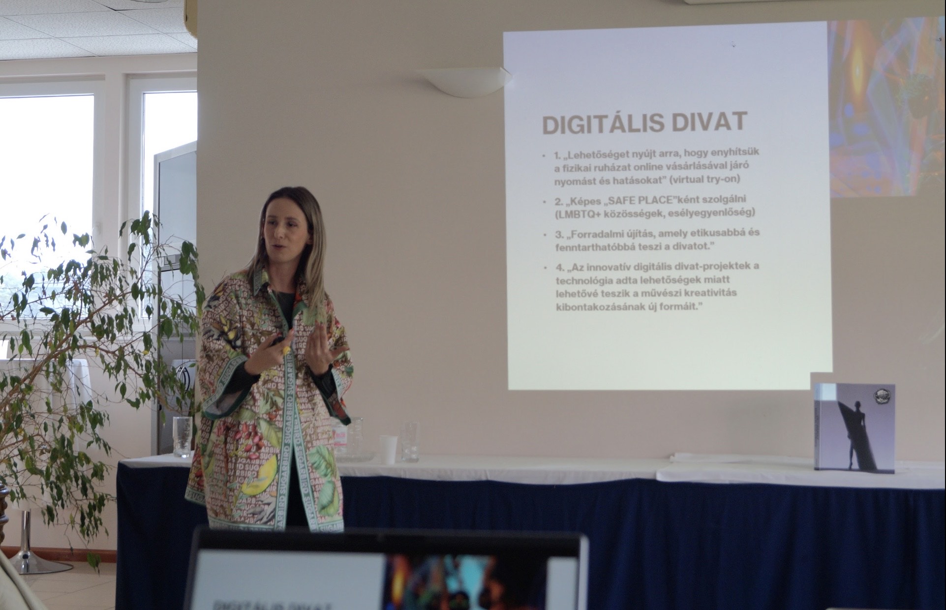 – Az előadásom egy korábbi kutatás kibővített változatára épült, amely 2024-ben jelent meg a Digital Fashion című nemzetközi kötetben (Bloomsbury Publishing). Két éve foglalkozom digitális divatkutatással. A CGI influencerek – vagyis számítógéppel generált véleményvezérek – teljesen új viszonyrendszert nyitnak meg a divatmarketingben és a divat kutatásában is. Egyfelől izgalmas technológiai és kreatív lehetőségek rejlenek bennük, másfelől torz testképet közvetítenek. Joanne Entwistle, divat szociológiai kutatásának egyik úttörője találóan fogalmaz: „a ruha egyszerre társadalmi jelentés és testi tapasztalat”. A CGI influencerek világa viszont gyakran eltávolodik a test tapasztalati valóságától. Az Instagram-vizualitás és az AI-avatarok személyessége inkább illúzió, mint valós kapcsolat. Ez veszélyes is lehet, különösen a fiatal közönségre nézve, ugyanakkor a technológia lehetőséget is ad egy újfajta vizualitás létrehozására.