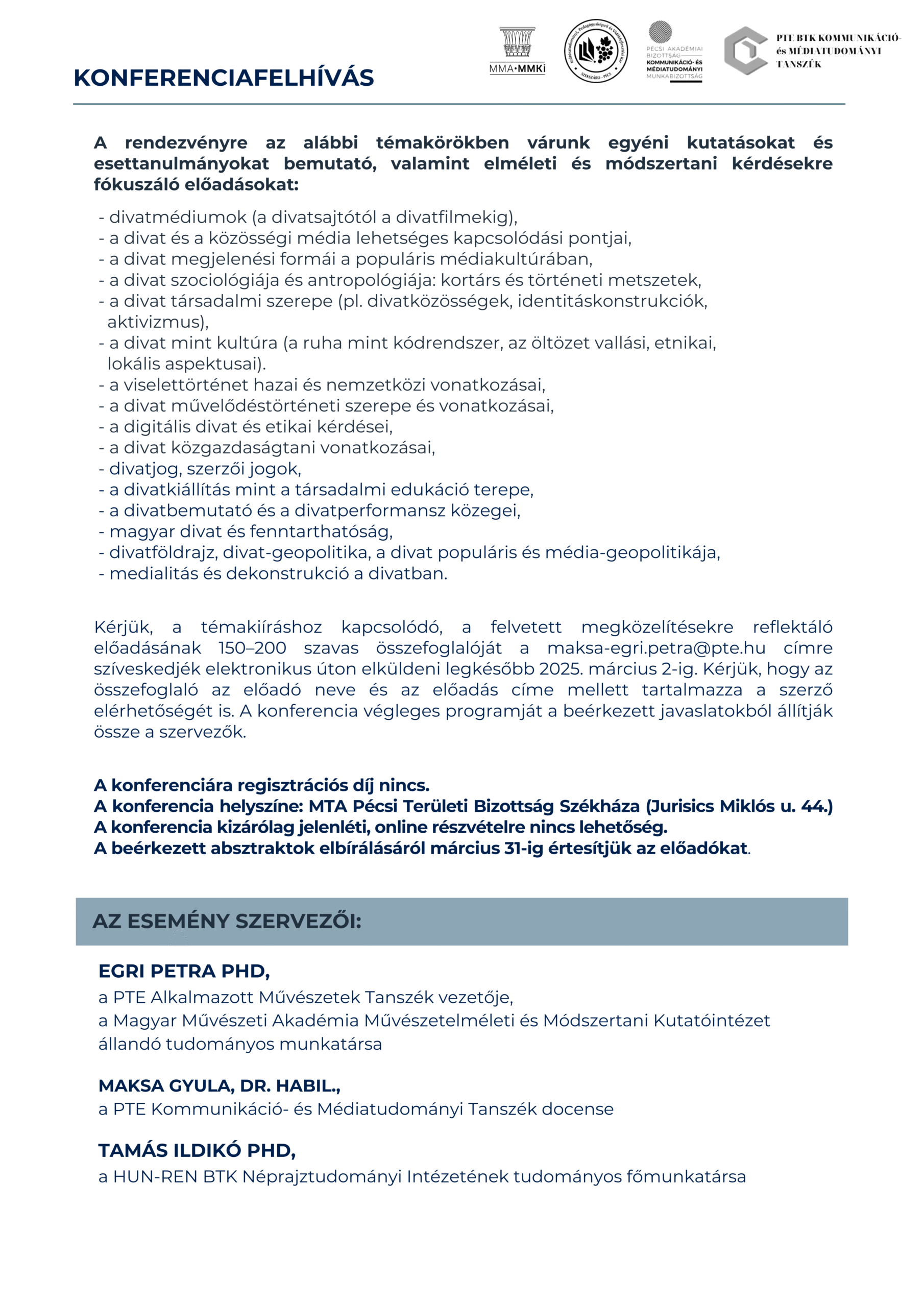 A konferencia helyszíne: MTA Pécsi Akadémiai Bizottság székháza (Jurisics Miklós u. 44.) A konferencia kizárólag jelenléti, online részvételre nincs lehetőség.