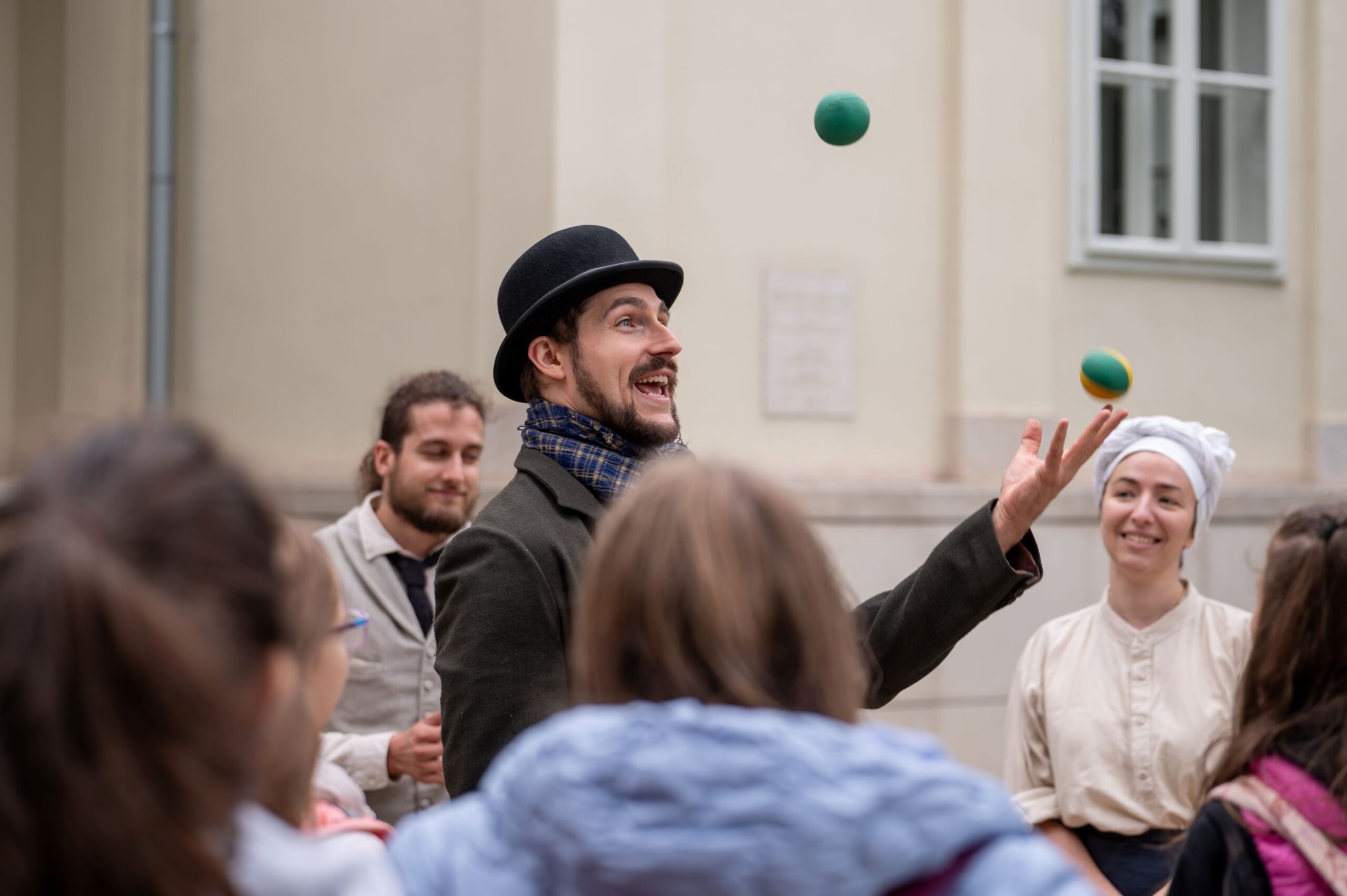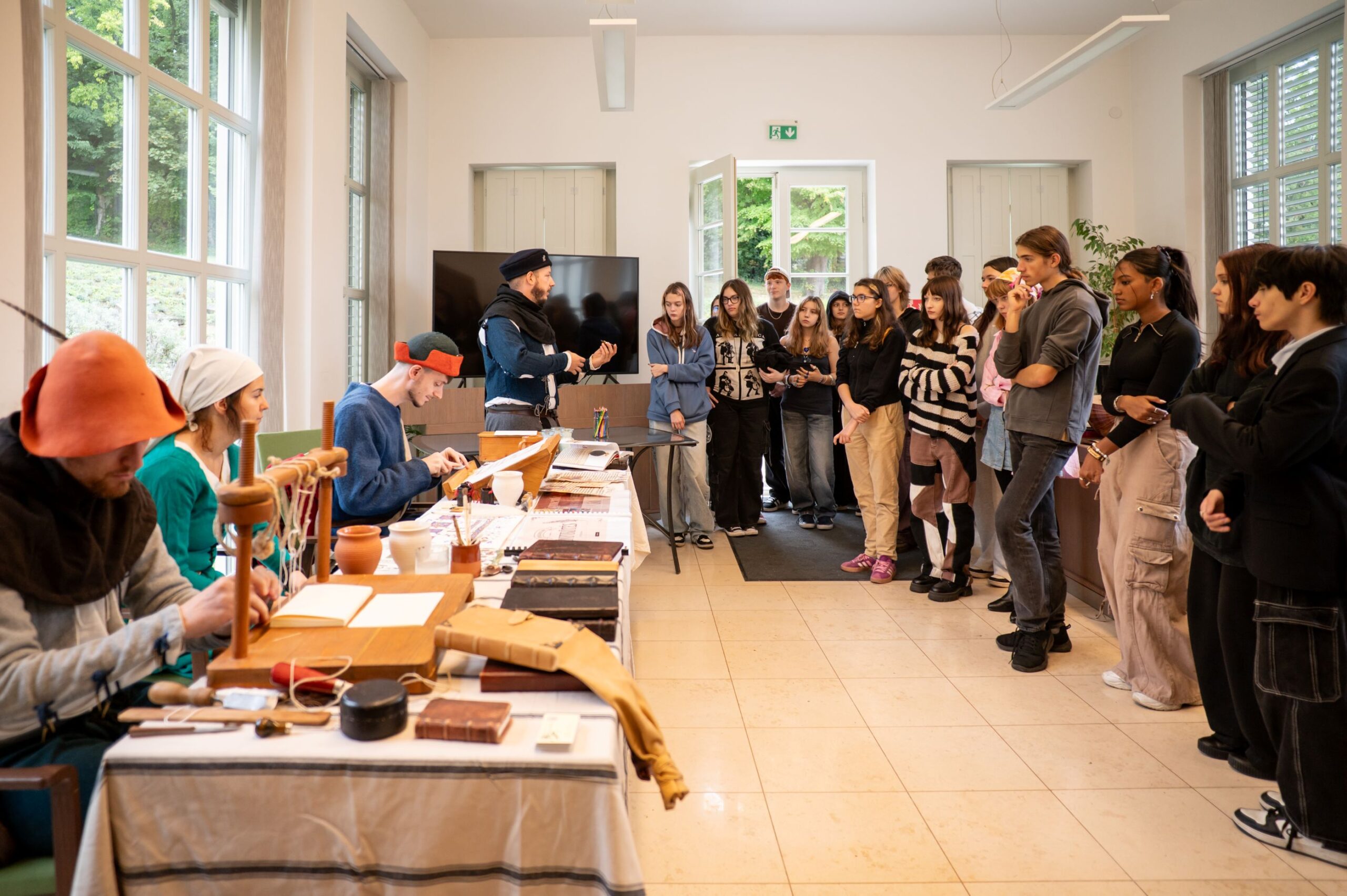 Délelőtt és kora délután a regisztrált alsó és felső tagozatos, valamint a középiskolás csoportok vették birtokba a kutatóintézetet, ahol Simándi László gólyalábas mesemondó, az MMA Művészeti Ösztöndíjprogram ösztöndíjas művésze mesékkel készült, a Mare Temporis közössége pedig Hunyadi Mátyás korának csepürágóit megelevenítve akrobatikus mutatványokkal várta őket. A gyermekek megismerkedtek az Árpád-kori pénzverővel, az írnokkal, a Magna Societas Falconis – A sólyom kompániája megszemélyesített karaktereinek segítségével pedig az iniciáléfestés és könyvkötés titkaival.