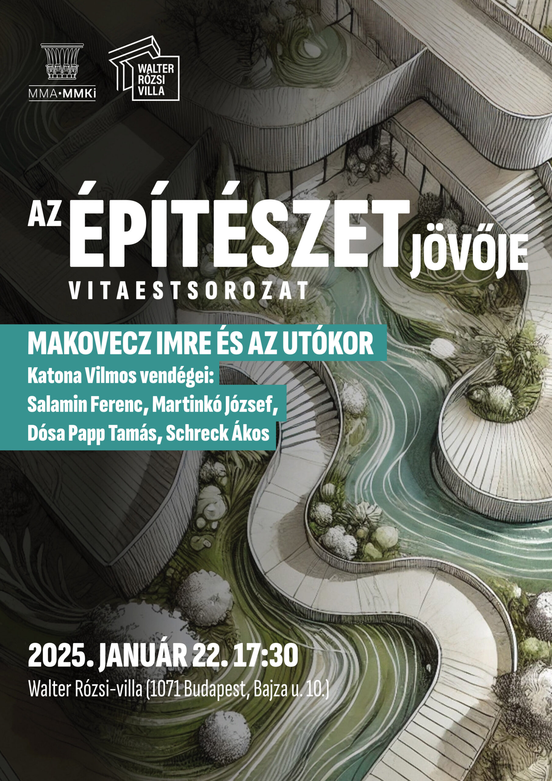 Az építészet jövője című új vitaestsorozatot azért hívta életre az MMA MMKI, hogy rávilágítson az építészet mindenkit érintő társadalmi és kulturális szerepére. Makovecz Imre munkássága meghatározó mérföldkő a magyar építészet történetében: szimbolikus jelentésű épületei és organikus építészeti szemlélete máig hatással vannak a szakma különböző területeire. A sorozatindító esten, január 22-én Salamin Ferenc, a Magyar Művészeti Akadémia rendes tagja, az Építőművészeti Tagozat vezetője; Martinkó József, az Octogon magazin főszerkesztője; Dósa Papp Tamás építész és Schreck Ákos, az MMA Művészeti Ösztöndíjprogram alumni ösztöndíjas művésze, a Minusplus építésziroda alapítója mondják el véleményüket. Az est moderátora Katona Vilmos építészteoretikus, az MMA Művészeti Ösztöndíjprogram alumni ösztöndíjasa.