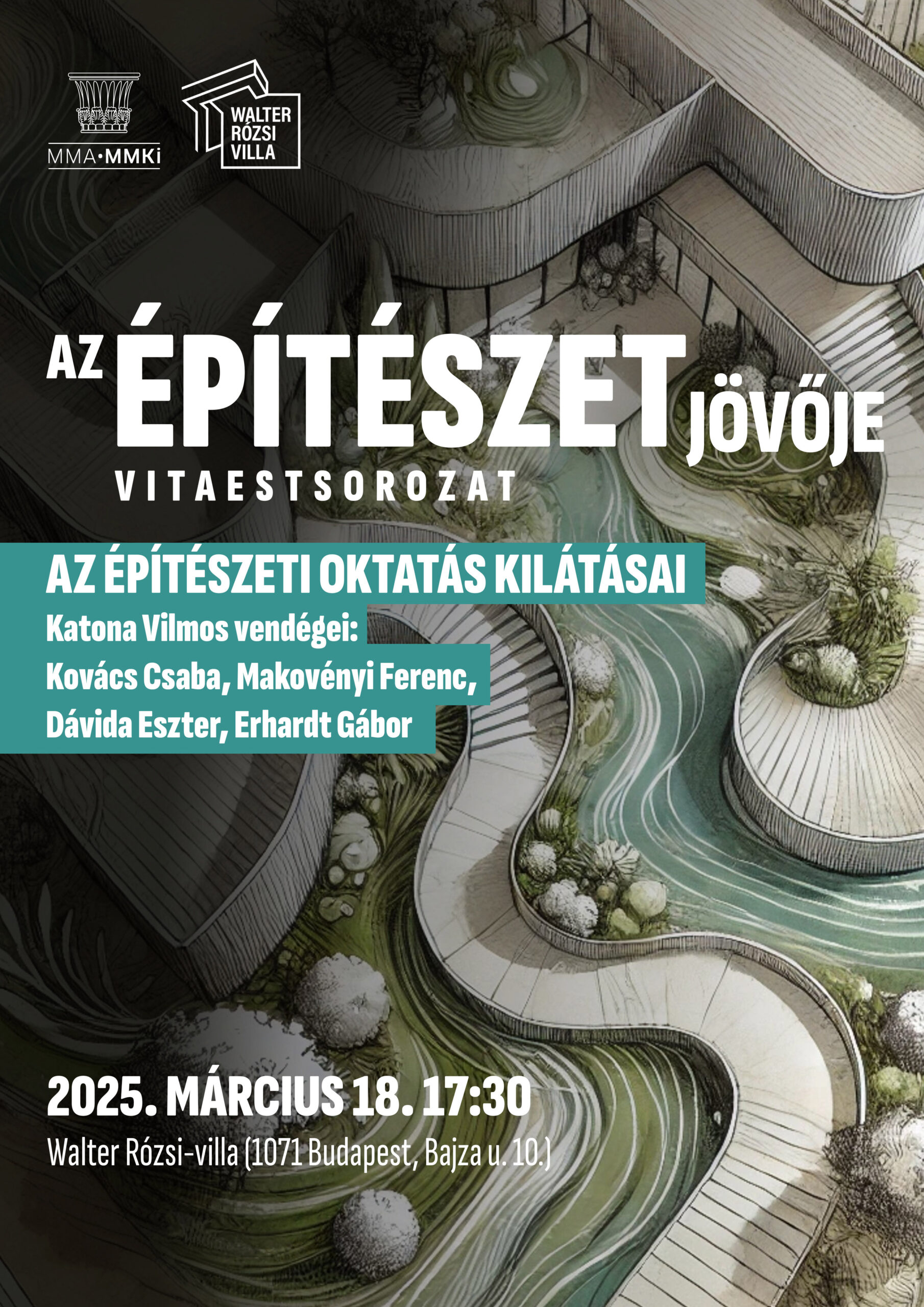 Makovényi Ferenc, a Szent István Egyetem (ma Óbudai Egyetem) Ybl Miklós Építéstudományi Karának volt dékánja, Kovács Csaba, a Moholy-Nagy Művészeti Egyetem Építészeti Intézetének volt igazgatója, Dávida Eszter, a Kortárs Építészeti Központ igazgatója és Erhardt Gábor, a Mathias Corvinus Collegium Építészet és Emlékezet Műhelyének vezetője közösen próbálják megválaszolni, merre kellene haladnia a magyar építészeti oktatásnak, és ehhez képest merre tart jelenleg. Az est moderátora Katona Vilmos építészteoretikus, az MMA Művészeti Ösztöndíjprogram alumni ösztöndíjasa.