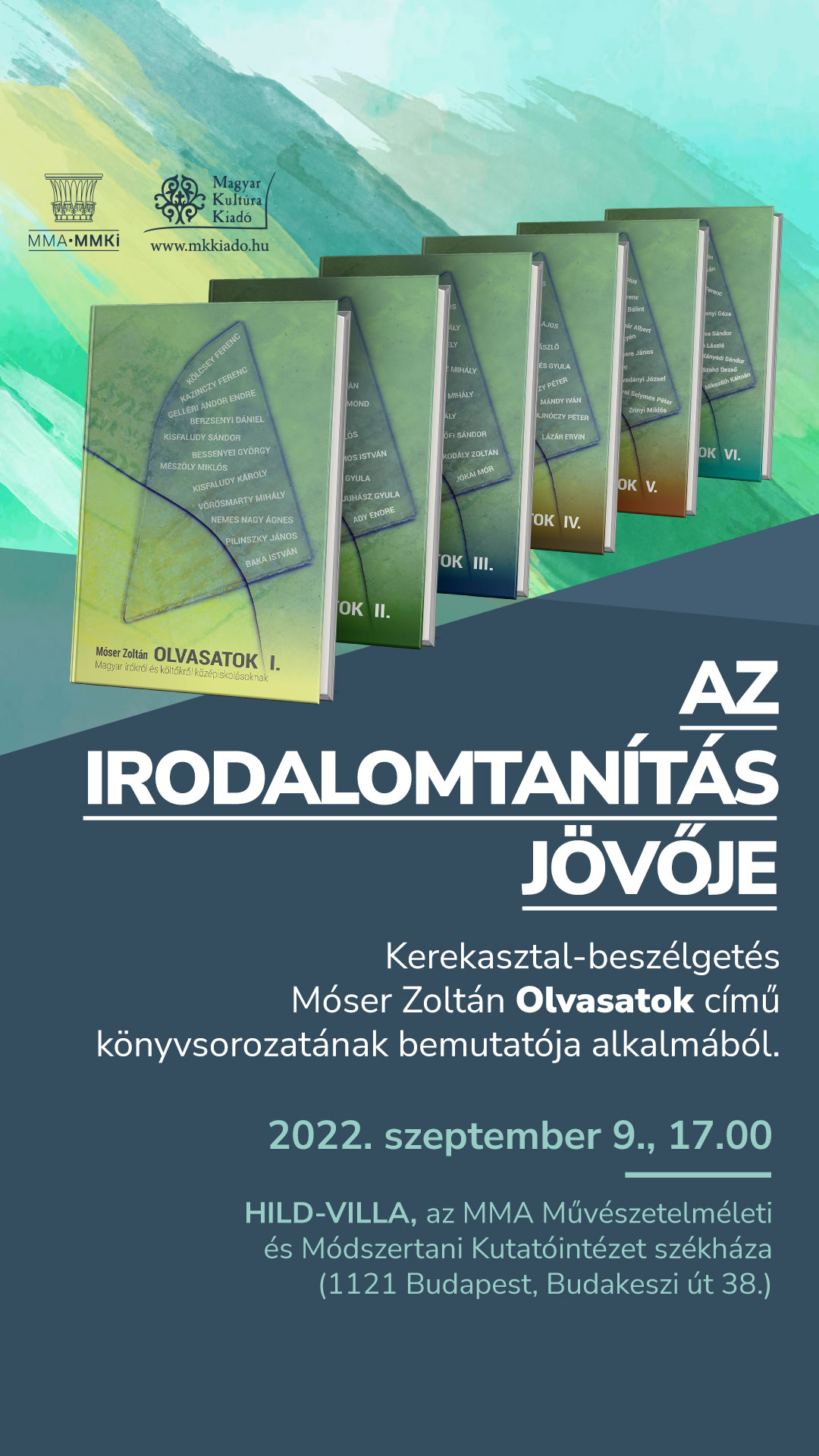 Az irodalomtanítás jövője címmel kerekasztal-beszélgetést szervez a Magyar Művészeti Akadémia Művészetelméleti és Módszertani Kutatóintézet (MMA MMKI) és a Magyar Kultúra Kiadó Móser Zoltán Olvasatok című könyvsorozatának bemutatására szeptember 9-én a Hild-villában.