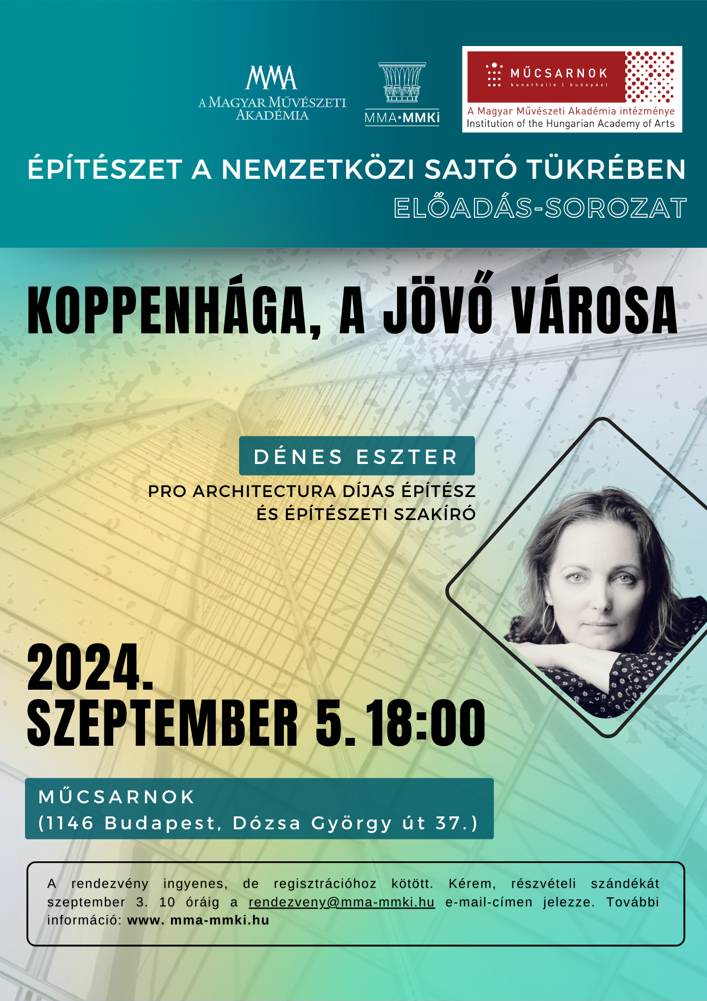 Az MMA Művészetelméleti és Módszertani Kutatóintézet (MMA MMKI) szervezésében szeptember 5-én és szeptember 11-én folytatódik Dénes Eszter Építészet a nemzetközi sajtó tükrében című előadás-sorozata, amelynek ezúttal a Műcsarnok ad otthont.