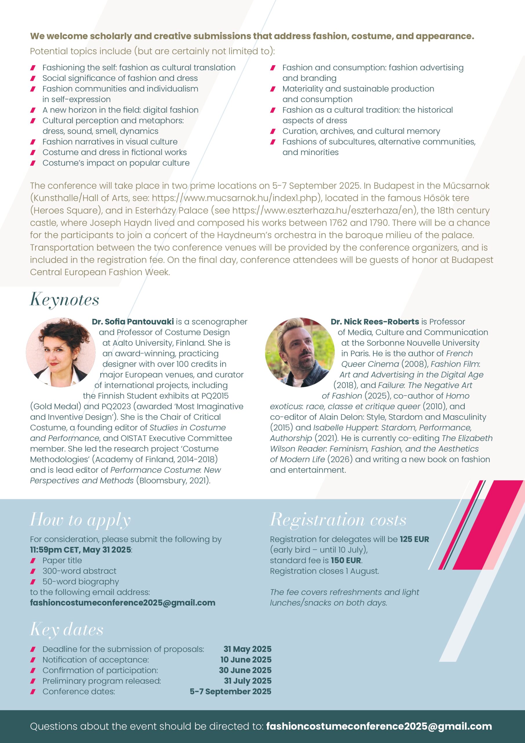 The conference will take place in two prime locations. In Budapest in the Műcsarnok (Palace of Exhibitions), located in the famous Hősök tere (Heroes Square), and in Schloss Esterházy, the 18th century castle, where composer Joseph Haydn was an artist in residence on 5-7 September 2025. Transportation between the two conference venues will be provided by the conference organizers. On the final day, conference speakers will be guests of honor at Budapest Central European Fashion Week.