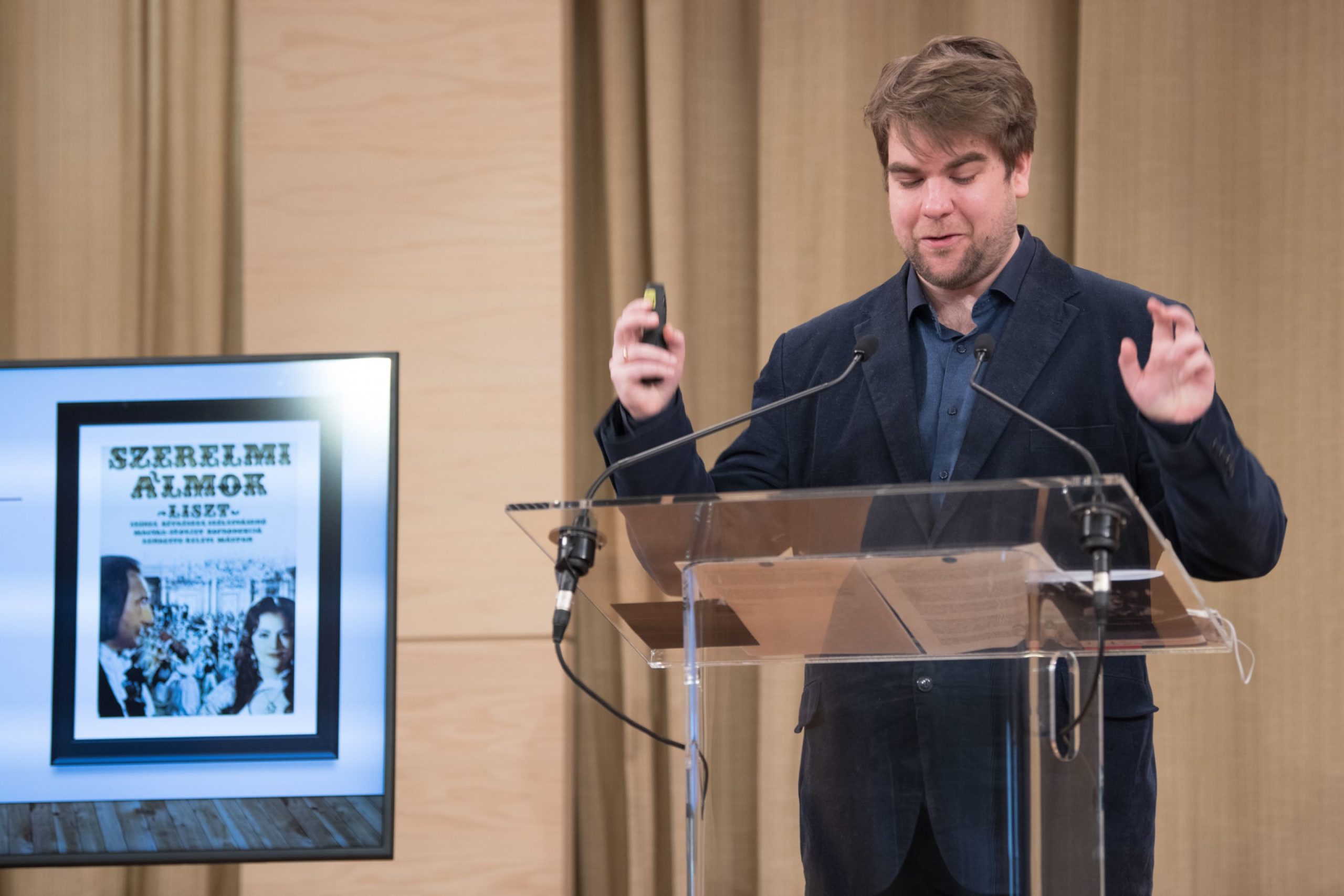 Németh Zsombor zenetörténész, hegedűművész, a Magyar Tudományos Akadémia Bölcsészettudományi Kutatóközpont Zenetudományi Intézet Bartók Archívumának kutatója, a Simplicissimus Kamaraegyüttes művészeti vezetője a Szerelmi álmok – Liszt című film zenéjéről beszélt prezentációjában. Mint arra az elején felhívta a figyelmet, Liszt Ferencnek, a magyar kultúra és zenetörténet egyik legnagyobb alakjának ezernél is több koncertje, sokszáz kompozíciója, írásai és pedagógiai, karmesteri munkája, illetve regényes fordulatokban és szerelmekben gazdag élete számtalan filmes alkotó fantáziáját mozgatta meg, karaktere így 41 mozgóképes alkotásban is megjelenik. Elsősorban az előadás címében is szereplő film zenéjének keletkezéstörténetét és a hozott anyagok összeszerkesztésének módszerét igyekezett megmutatni, középpontban Farkas Ferenc és Cziffra György tevékenységével.