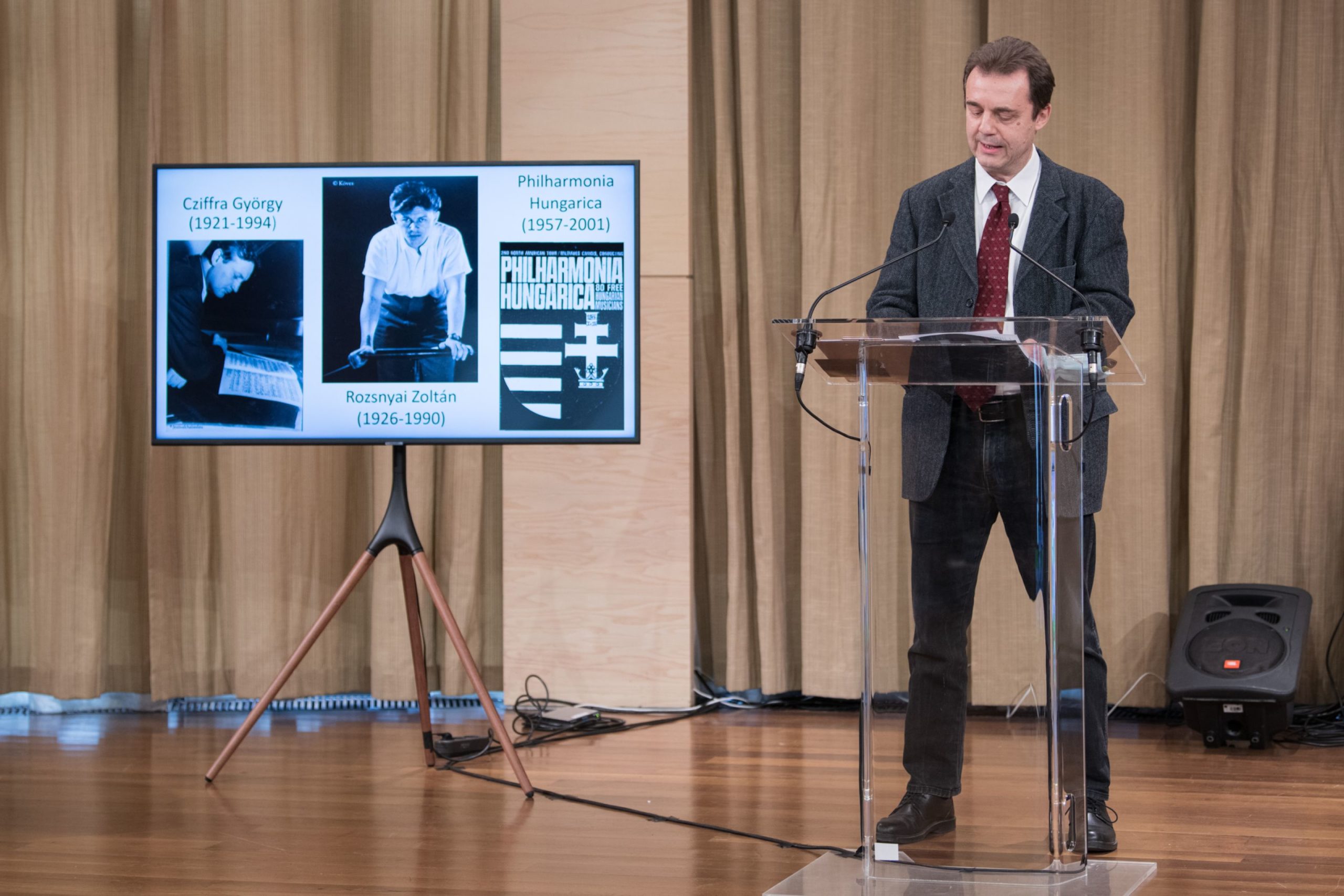 Zipernovszky Kornél újságíró, szerkesztő egy rövid szünet után zene- és politikatörténeti előadásában többek közt arról beszélt, miként fonódott össze Cziffra György és Rozsnyai Zoltán személyes sorsa amellett, hogy szoros barátságot ápoltak – mindezt úgy, hogy igyekezett félretenni a legendákat. Mint arra rávilágított, mindketten elmenekültek az országból a forradalom bukását követően, majd Cziffra pályája zongoraművészként eljutott a tehetségéhez méltó csúcsra, Rozsnyai pedig még Ausztriában megalapította és sikerre vitte a Philharmonia Hungaricát, amelyet emigráns nemzeti szimfonikus zenekarnak tartanak, és amely végül Németországban talált otthonra.